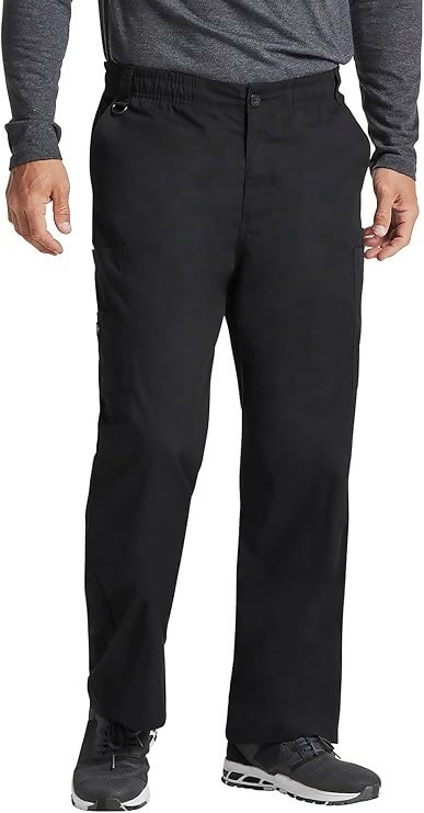 - Elastic-waist scrub pant featuring zip fly with button closure and logo patch at right leg